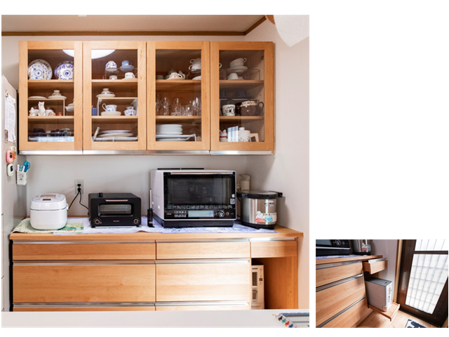 以前は、少し離れた場所に置かれていらっしゃったお米ストッカーも近くに収めることができ、カウンターには、電気製品も並び、使い勝手もよくなられたようです。