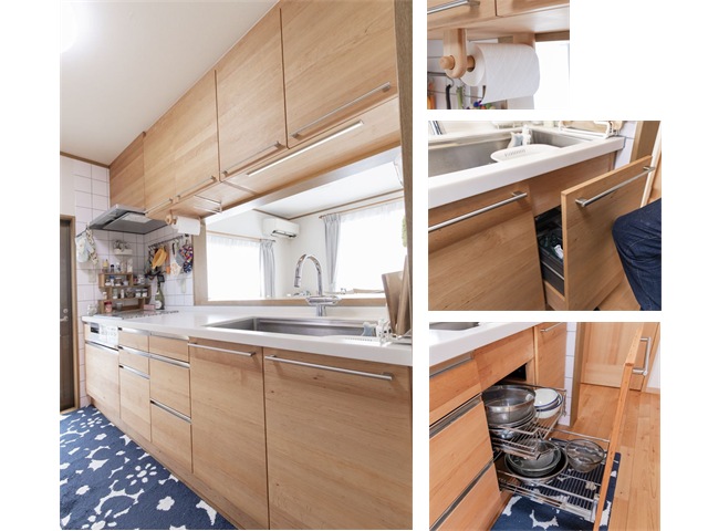 シンクの左下には、湿気がこもらないようにバスケット引出を2段にしました。